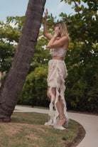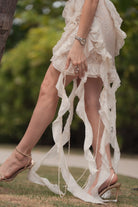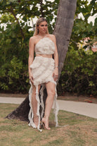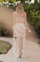 This dreamy design features soft layered ruffles that move with every step, a flattering halter neckline, and a playful lace-up back that gives it just the right touch of allure. The asymmetrical hem adds flow and drama, making it the kind of dress that instantly turns heads.