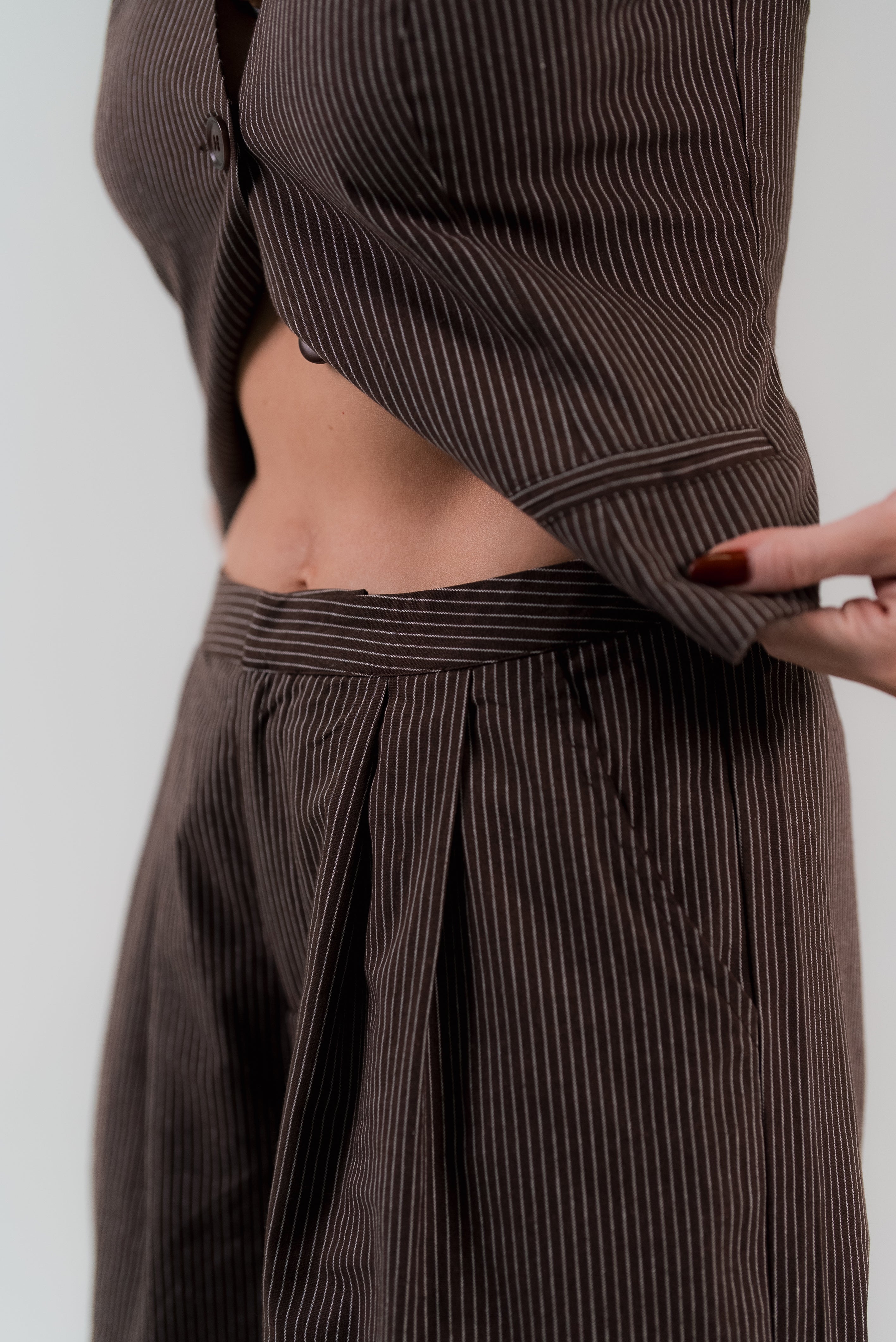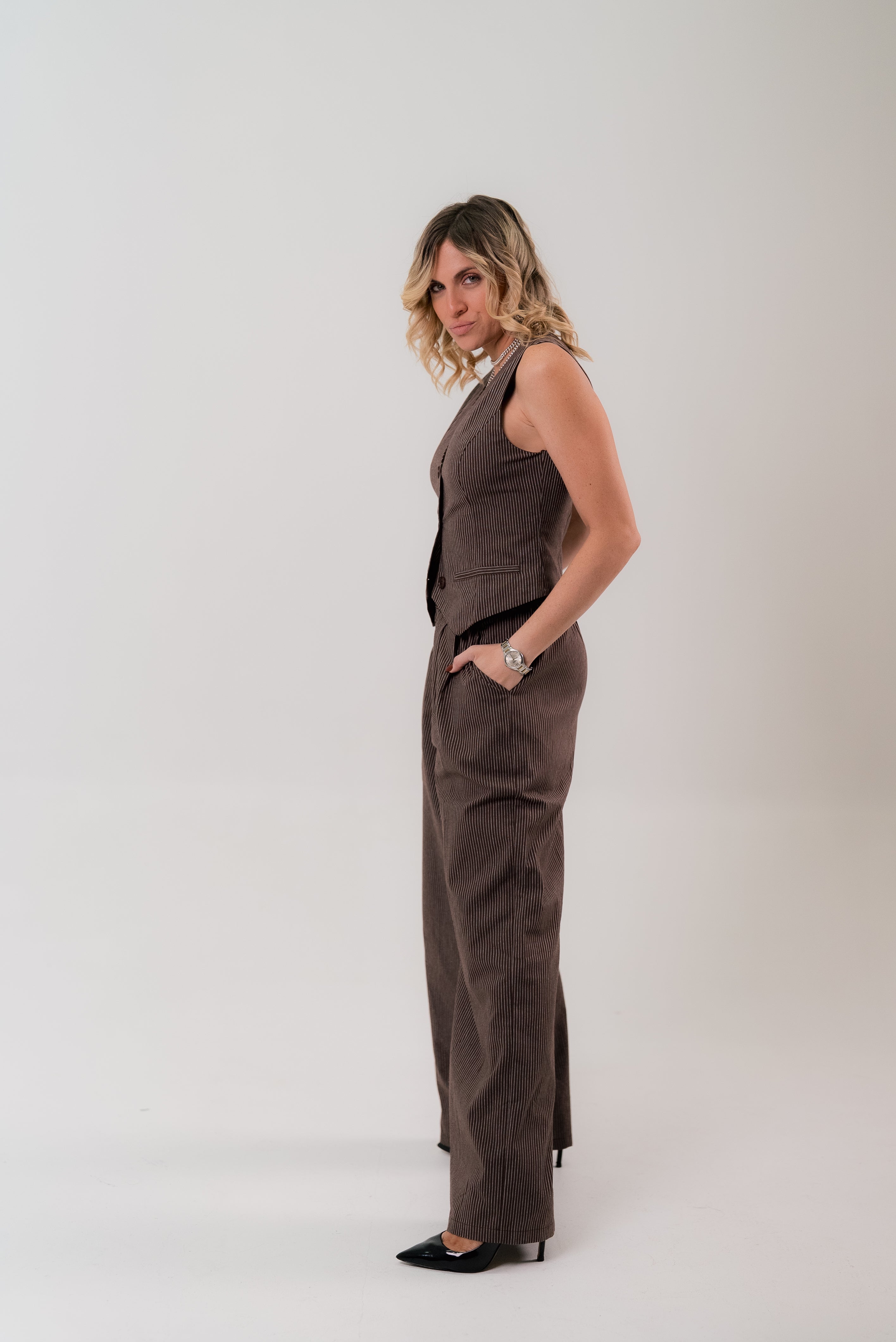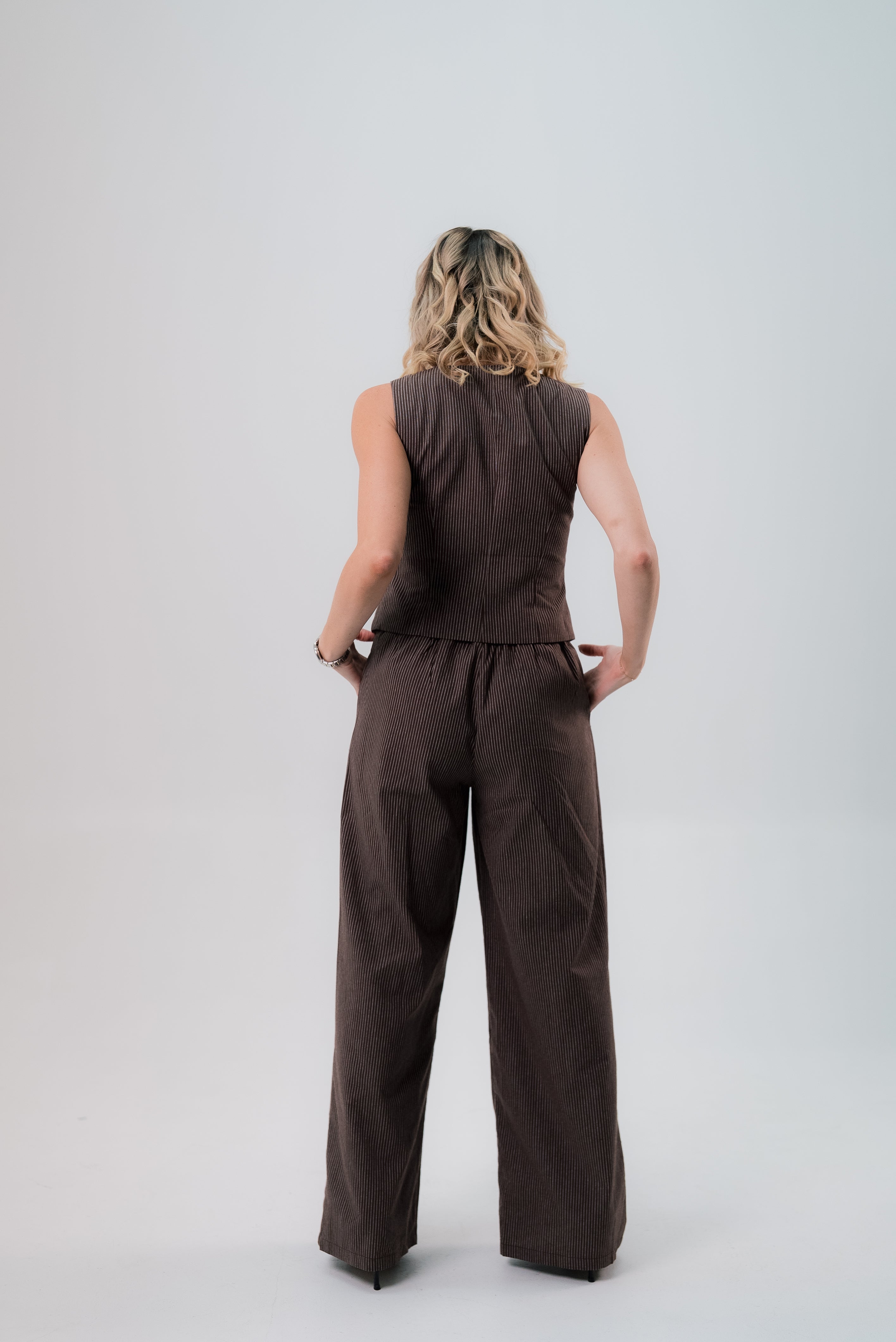 Meet the Fleuris Set, where tailored elegance meets effortless confidence. This matching vest-and-trouser ensemble features fine pinstripes that lengthen the silhouette and create a refined, elongated look. The fitted vest sculpts the waist beautifully, while the wide-leg trousers offer movement, comfort, and timeless sophistication.