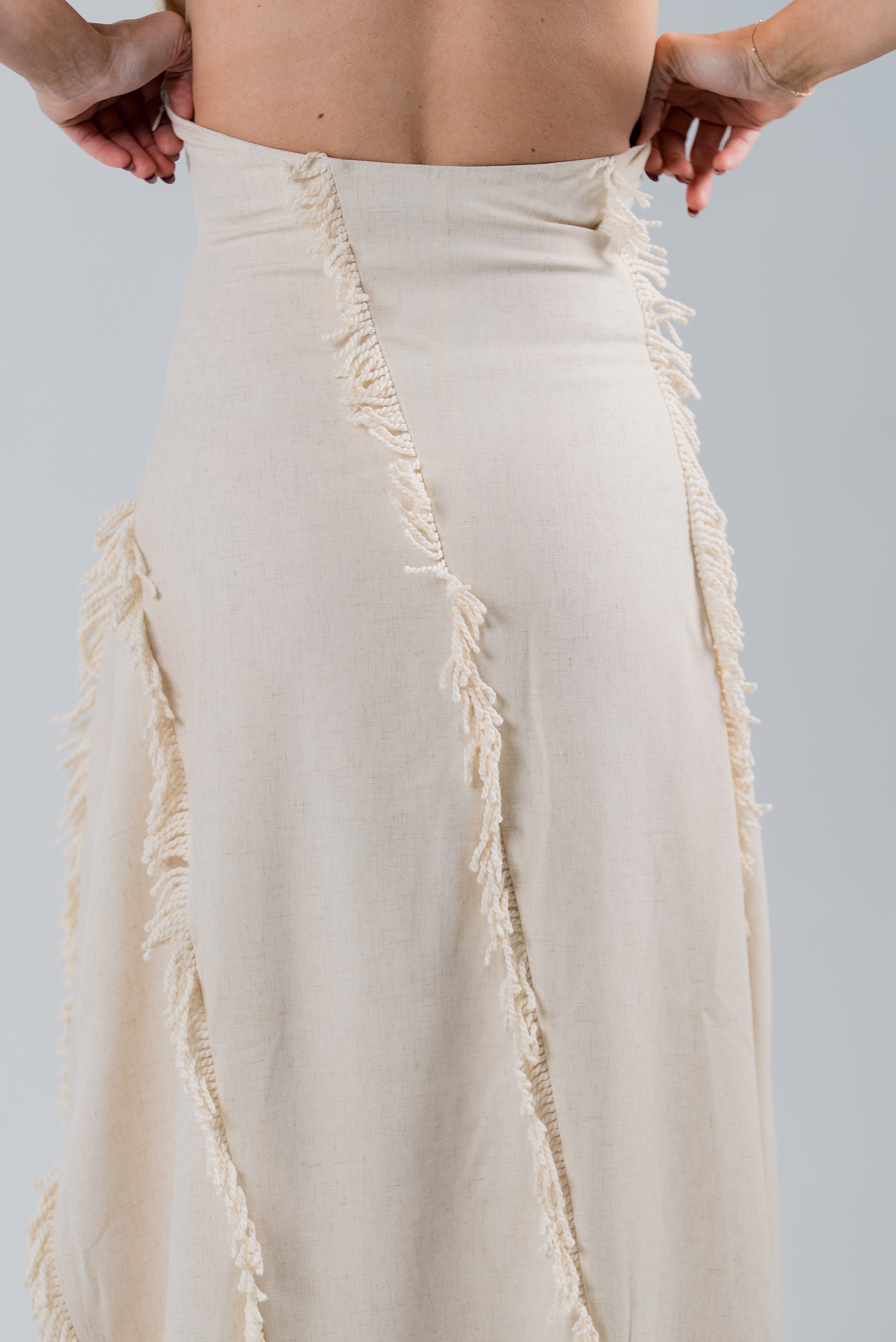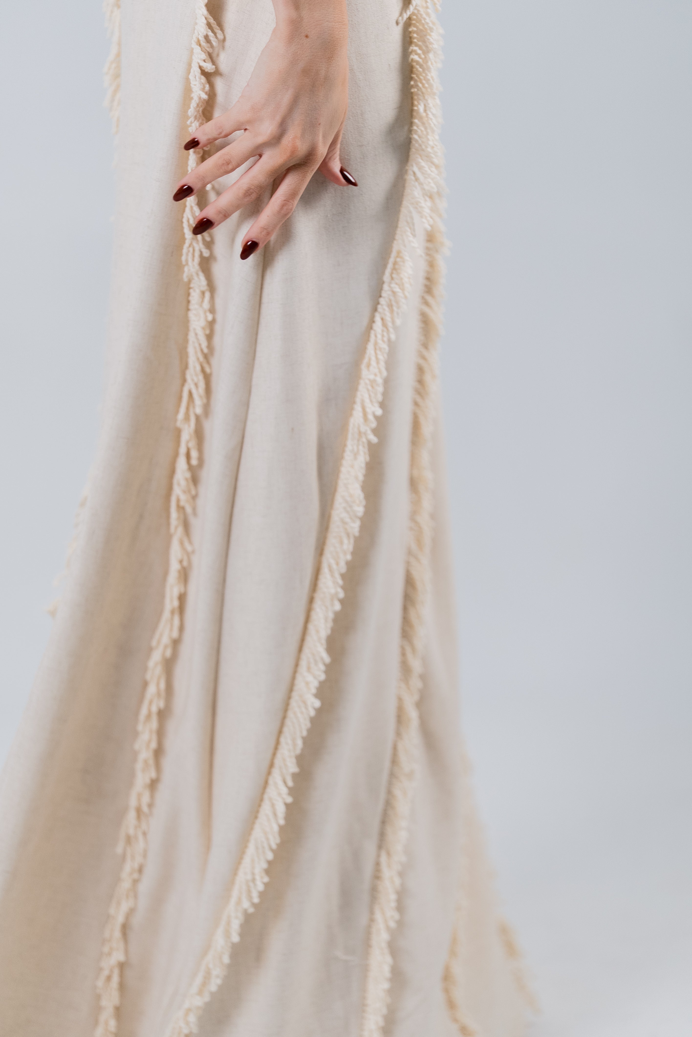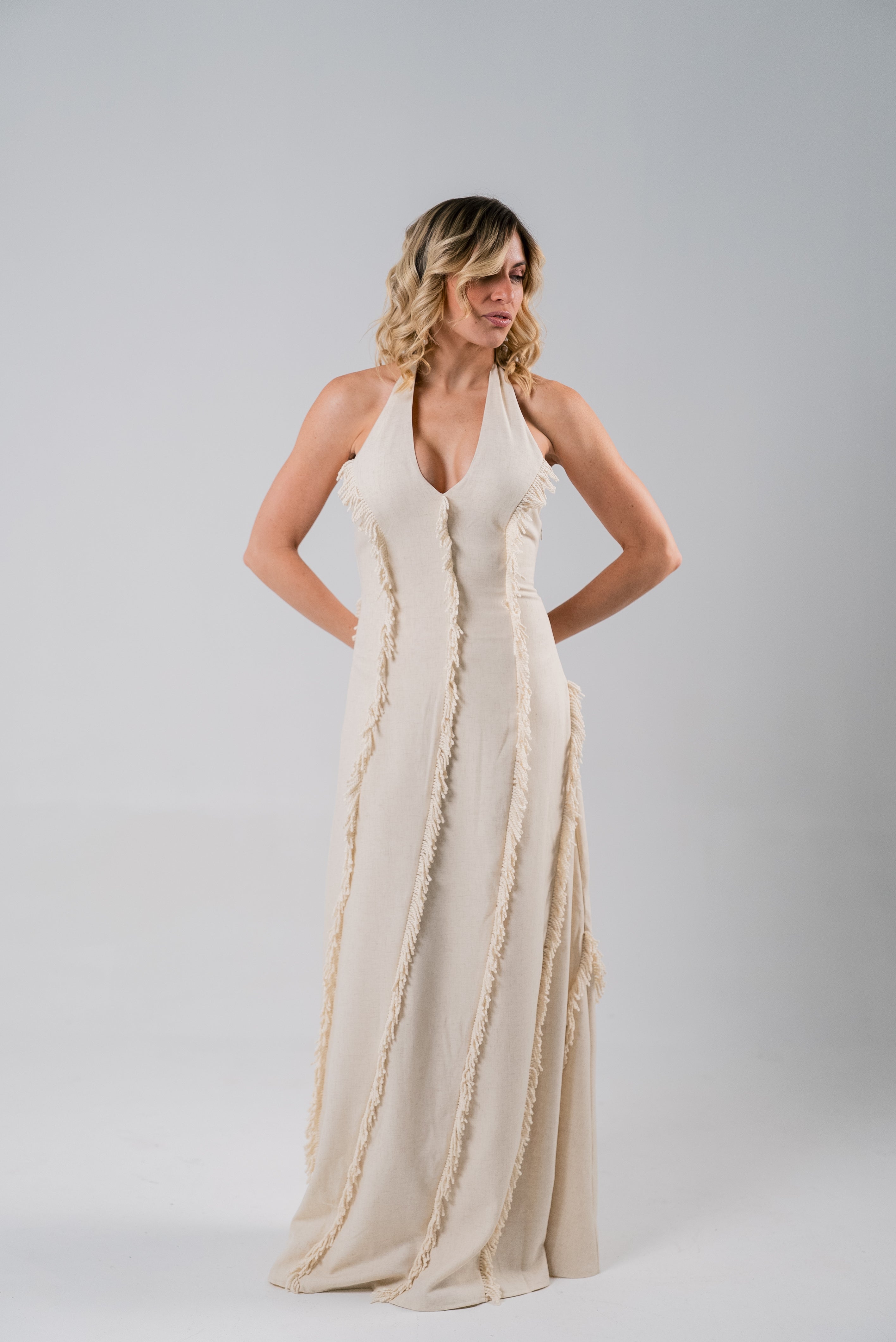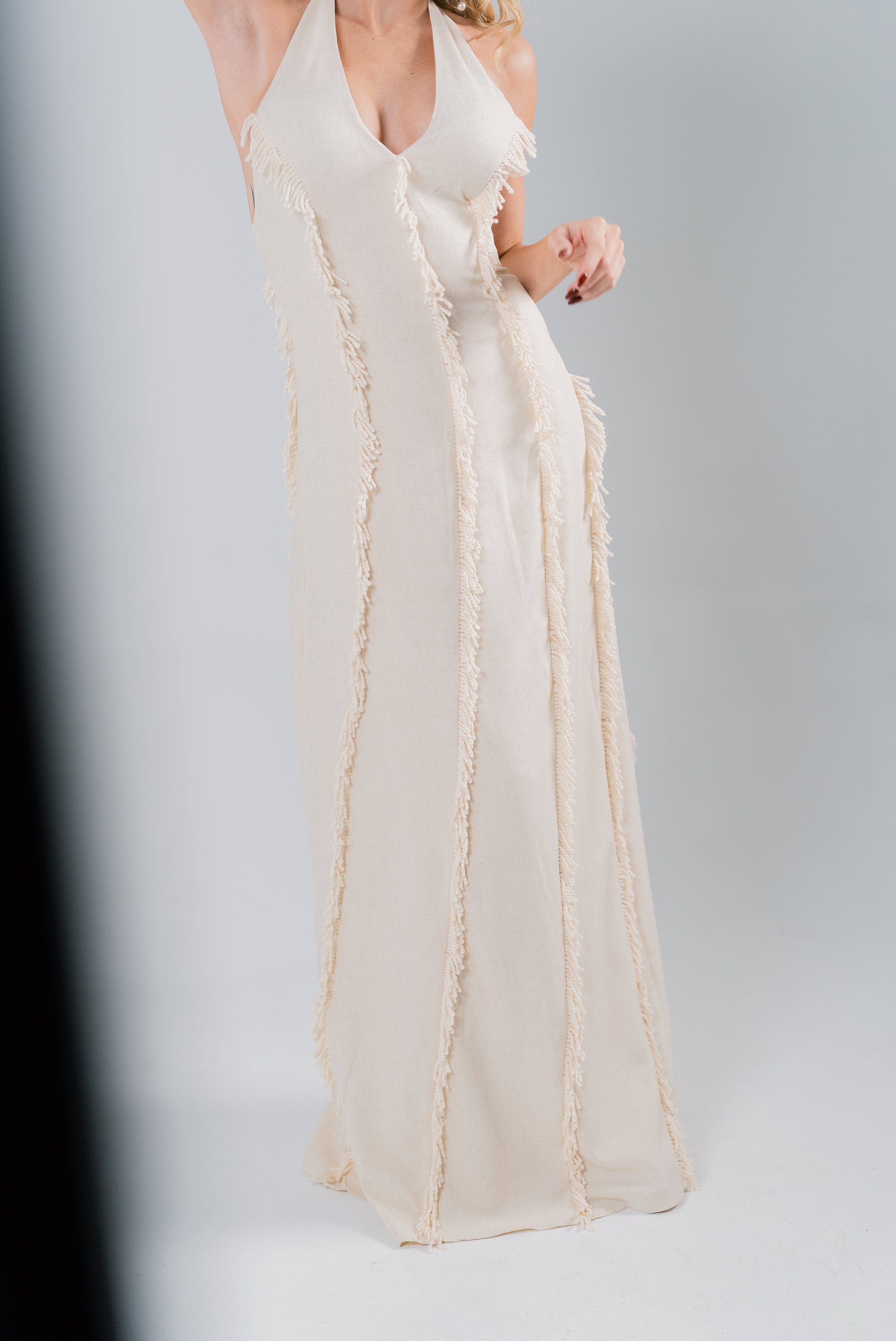 The Jardin Dress is where effortless grace meets modern luxury. Crafted in a soft neutral tone with a halter neckline that highlights the shoulders beautifully, this gown drapes in a way that feels both feminine and powerful. The cascading fringe lines create vertical movement, elongating the figure and giving the dress a dreamy, sculpted flow 🤍.