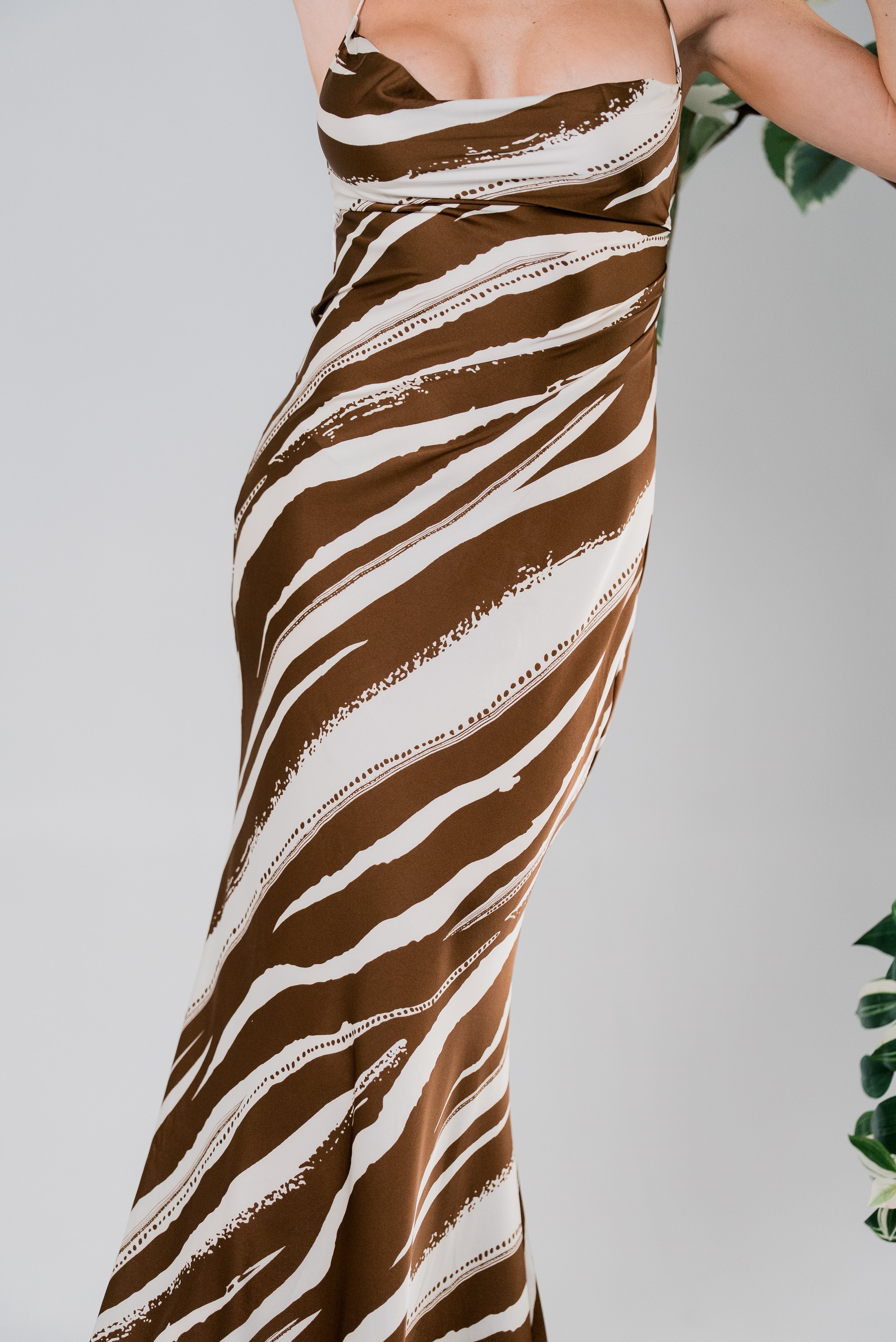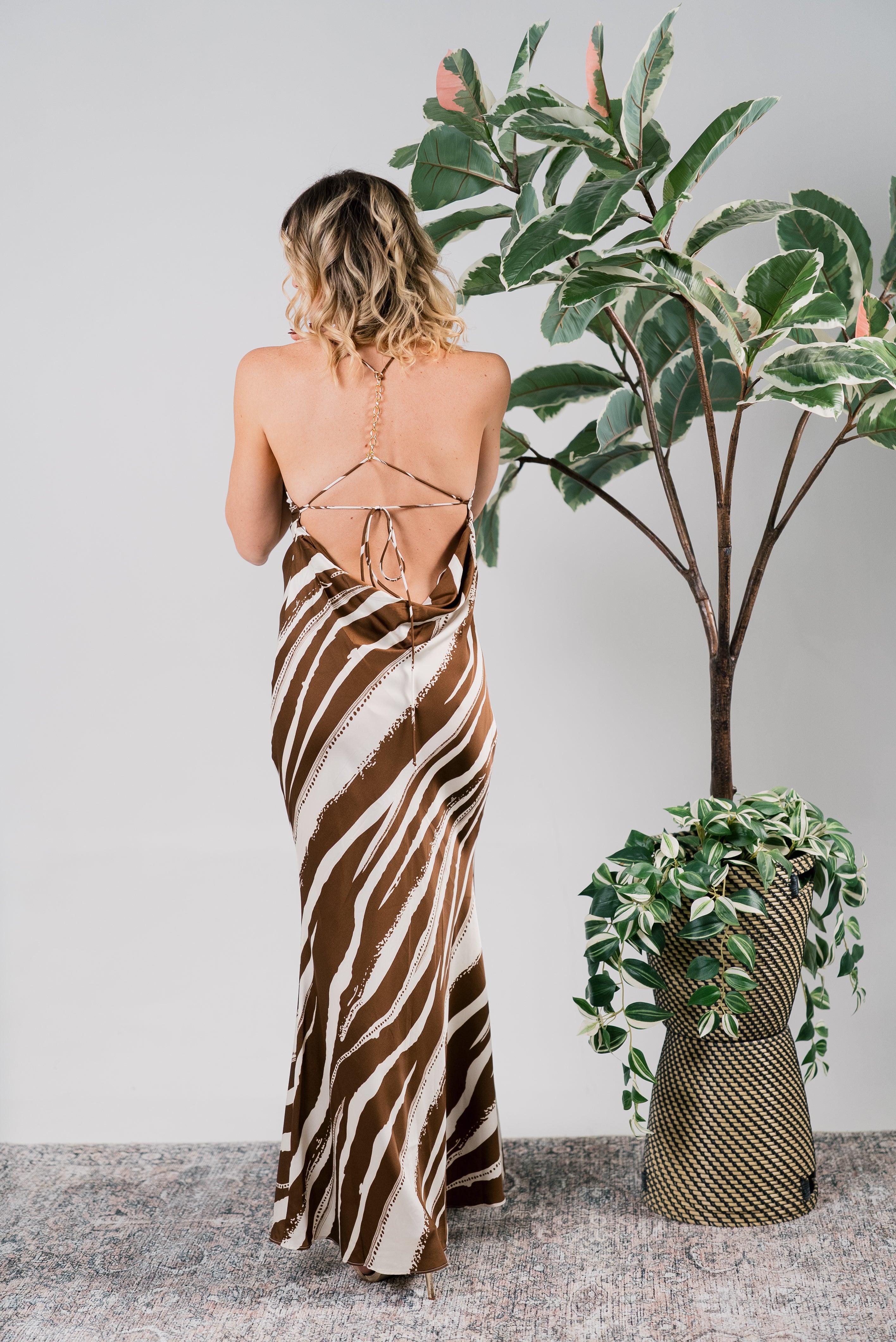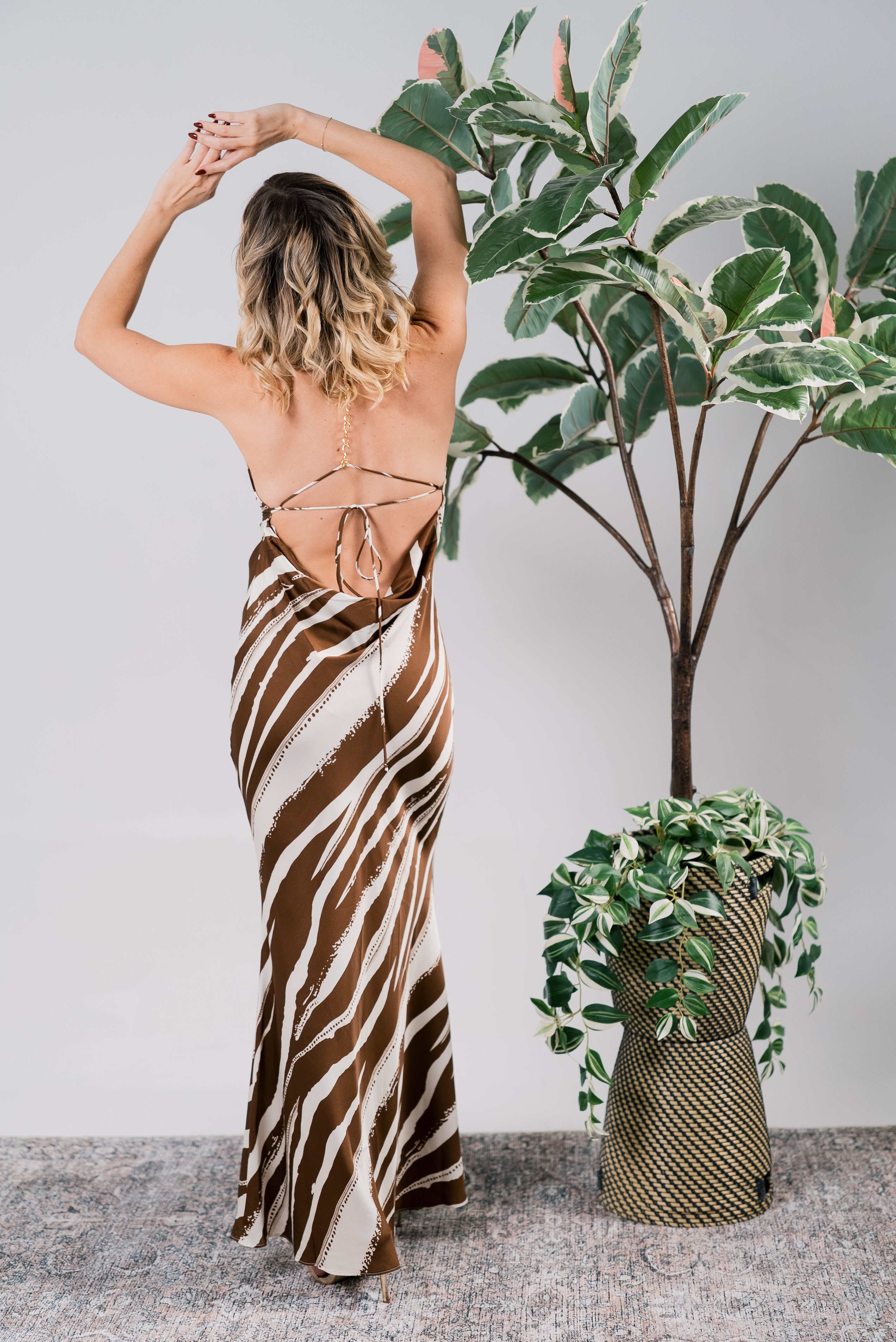 The Varenne Dress is a statement of confidence wrapped in pure elegance. This silky, floor-length silhouette hugs the body with softness and movement, creating a look that is equal parts glamorous and feminine. The rich brown and ivory swirl print elongates the figure beautifully, while the delicate straps and open back add a touch of irresistible allure 🤎.